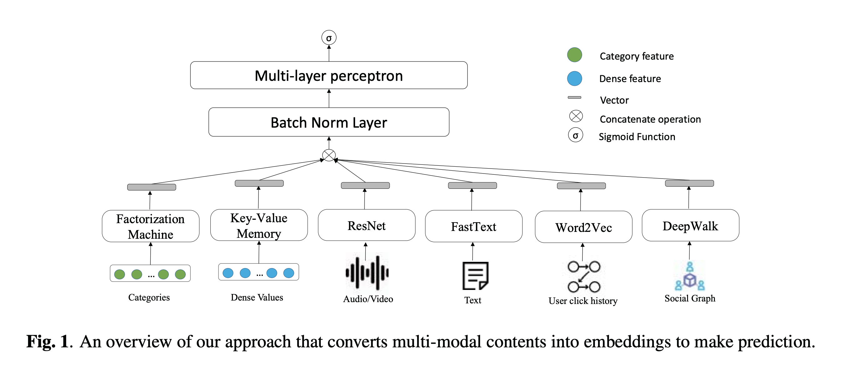 在这项工作中,我们研究如何利用具有不同结构的多峰特征。 具体来说,我们的方法首先将多模式内容转换为嵌入空间中的向量,然后将这些向量连接起来作为多层感知器(MLP)的输入。 同时,我们提出了一种新颖的键-值存储器[6],它将密集的实值映射到向量中,从而可以通过非线性方式获得更多的语义。 训练MLP的一个显着缺点是嵌入的分布随内容的不同而变化,这不利地减慢了训练速度。 为了解决这个问题,我们将批处理归一化到输入中。