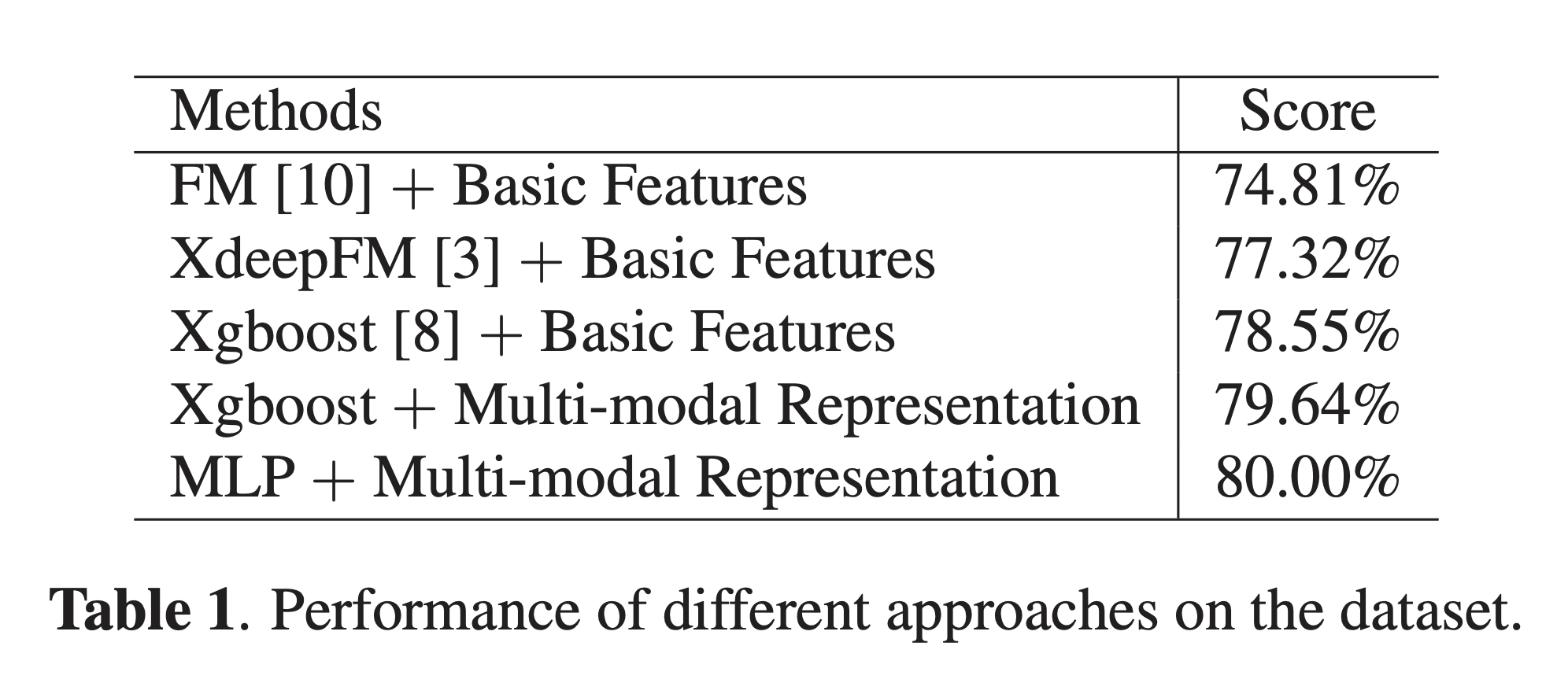 我们在数据集上报告了现有方法的结果,并证明了我们的多模式表示学习是提高当前推荐系统性能的有效方法。 我们实现了几种方法,包括FM [10],这是一个分解因子的机器。 XdeepFM,先进的广泛深度神经网络,可用于CTR预测; Xgboost是可扩展的树增强系统。 基本的基本特征允许模型仅使用分类特征进行预测,而多峰特征是本文提出的多峰表示。 根据表1,我们可以看到,将多模式表示应用于Xgboost模型会产生进一步的改进,绝对增益为1%。 此外,我们通过提供多模式表示将MLP与批处理规范层结合使用,以80.00%的得分获得优异的性能,这表明我们的多模式表示可用于不同的模型。