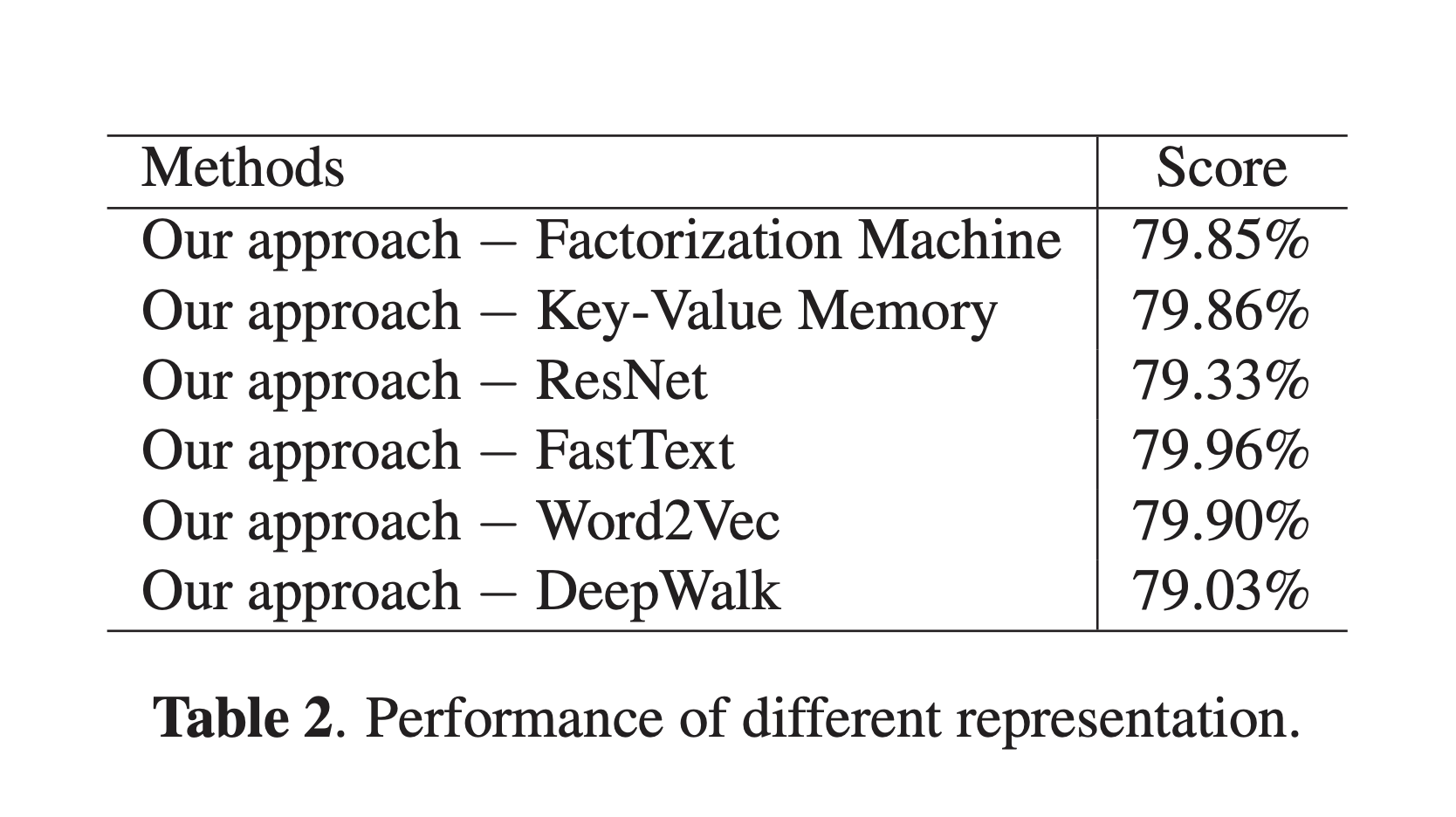 我们进行消融分析,以更好地了解各种组件如何影响我们的表现的整体表现。 我们删除每个组件以分别分析它们的贡献。 表2显示,消融DeepWalk时,得分从80.00%下降至79.03%,这表明社交图在短视频推荐场景中的重要性。 删除ResNet后,得分下降至79.33%。 这与我们的直觉一致,即视频/音频的内容是为用户推荐更多简短视频的关键因素。 我们可以看到其他表示形式也带来了0.1%〜0.2%的改善。