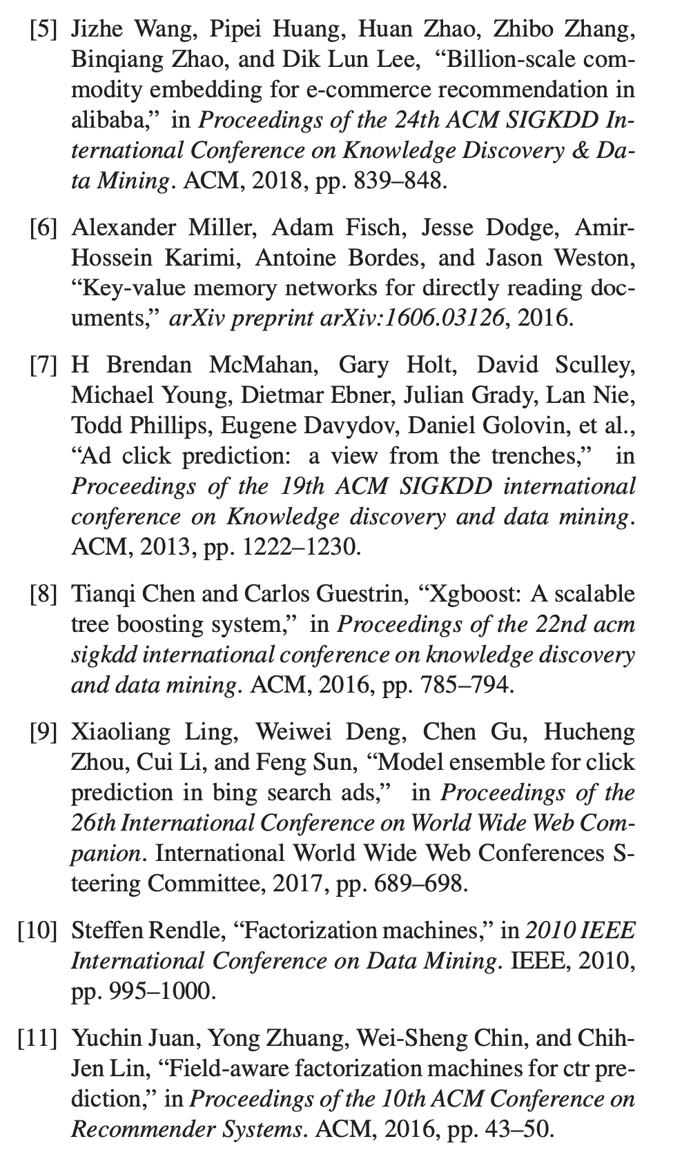 线性模型,例如使用FTRL的逻辑回归[7],由于易于管理,维护和部署而被广泛采用。 但是,线性模型缺乏学习隐藏特征的能力,这需要大量的工程交叉特征才能获得更好的性能。 因此,一些研究人员利用增强决策树[8]来帮助构建特征转换[9]。 为了克服高维和稀疏特征的问题,分解机器[10,11]将每个特征嵌入到低维潜矢量中。 与非因式分解模型相比,由于能够通过两个潜在向量的乘积进行推荐,因此它们能够学习特征交互。