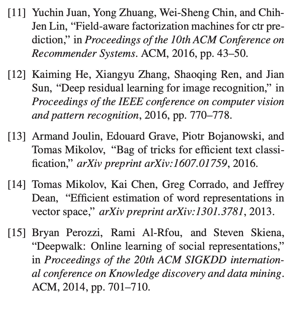 在本节中,我们描述如何学习我们的多模式表示。 对于Word2Vec和DeepWalk,这些方法可以在无人监督的情况下学习用户点击历史和社交图的表示(有关学习的更多详细信息,请参见[14,15])。 音频和视频的表示形式是从ResNet预训练中提取的。 其他嵌入将通过最大化地面真理的对数概率之和来进行有监督的训练。