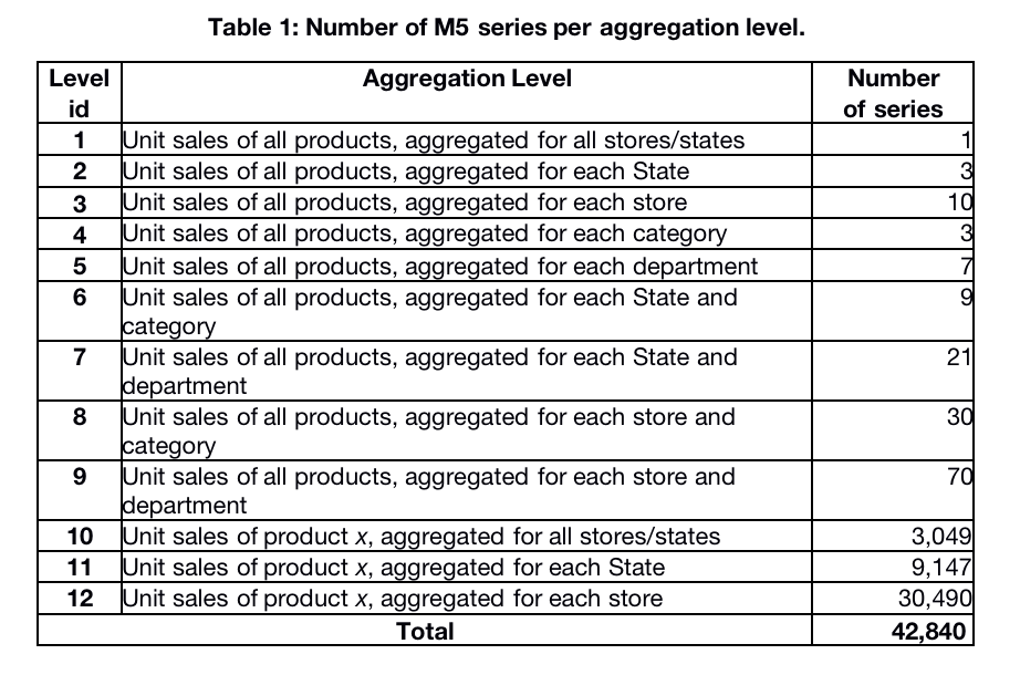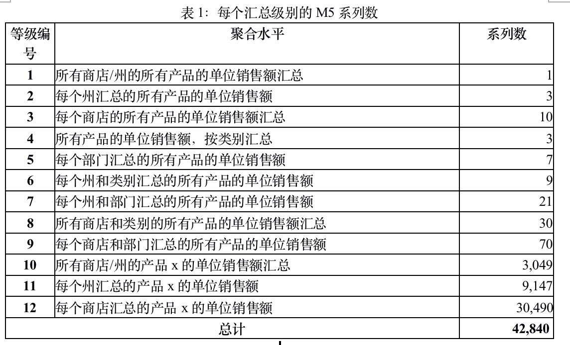 如前所述,可以扩展此加权方案,以考虑更多的商店,地理区域,产品类别和产品部门。 由于M5竞赛涉及十二个聚合级别,因此将K设置为等于12,并计算系列的权重,以使它们在每个聚合级别上的总和为1。