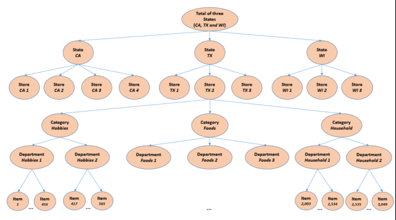 由沃尔玛慷慨提供的M5数据集涉及在美国销售的各种产品的单位销售,以分组时间序列的形式组织。 更具体地说,该数据集涉及3,049种产品的单位销售额,分为3个产品类别(爱好,食品和家庭)和7个产品部门,其中上述类别被分解。 这些产品在三个州(CA,TX和WI)的十家商店中销售。 在这方面,可以跨产品类别或地理区域映射层次结构的底层,即产品商店的销售量,如下所示: