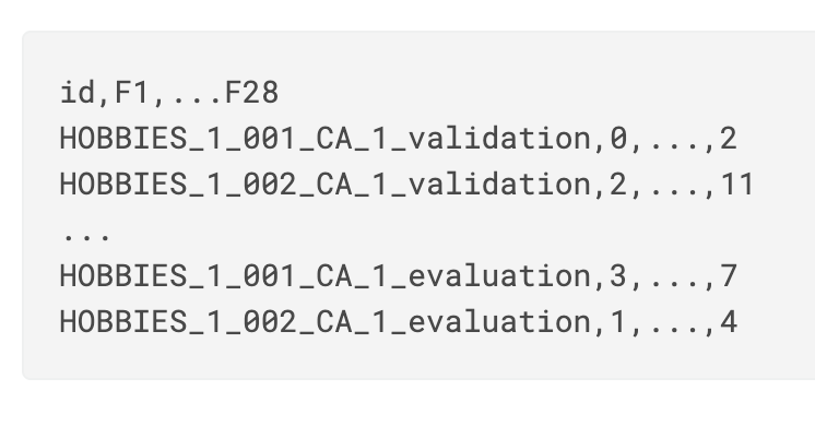 每行包含一个ID,该ID是item_id和store_id的串联,它可以是验证(对应于Public排行榜)或评估(对应于Private排行榜)。 您预计每行售出的物品有28个预测天(F1-F28)。 对于验证行,这对应于d_1914-d_1941,对于评估行,这对应于d_1942-d_1969。 (注意:比赛结束前一个月,将提供验证行的基本信息。)