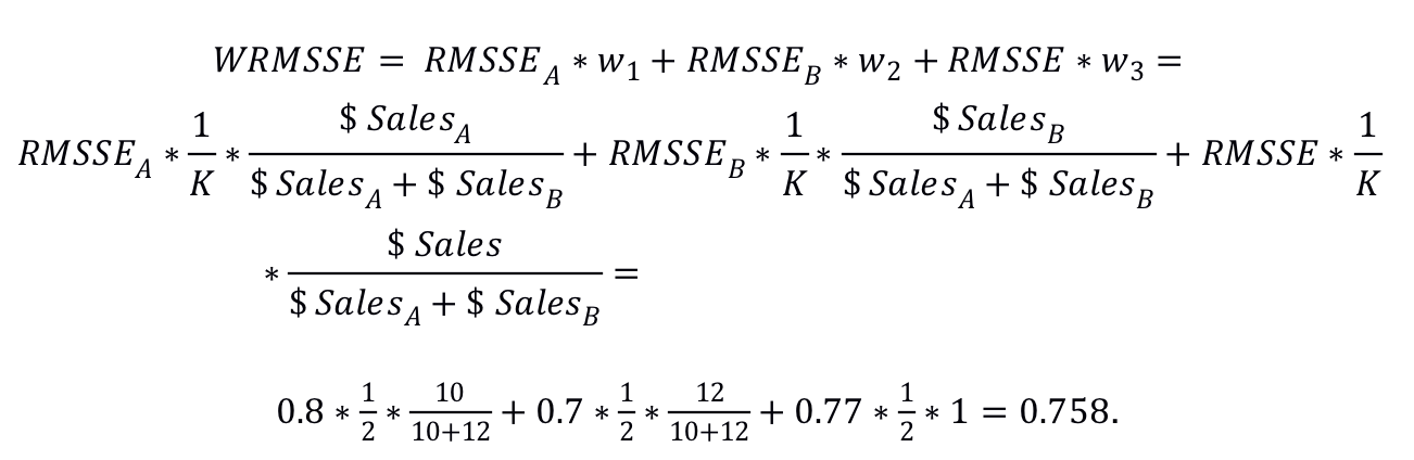 在训练样本的最后28天中,产品A的销售总额为10美元,而产品B的销售总额为12美元。 因此,过去28天产品A和B的总美元销售额为22美元。 还假定使用一种预测方法来推导产品A,产品B及其总单位销售的积分预测,分别显示误差RMSSEA = 0.8,RMSSEB = 0.7和RMSSE = 0.77。 如果M5数据集仅涉及这三个系列,则该方法的最终WRMSSE得分为